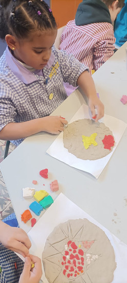 Aquestes fotos mostren els nens i nenes d’I5 mentre treballen l’obra de Gaudí. Després de visitar el Park Güell i observar els sols de trencadís, han realitzat la seva pròpia producció artística. Mitjançant aquesta activitat han experimentat amb formes, colors i materials, simulant el trencadís característic de Gaudí. Aquest treball és el resultat de la seva creativitat i de tot allò que han après a partir de l'experiència viscuda.